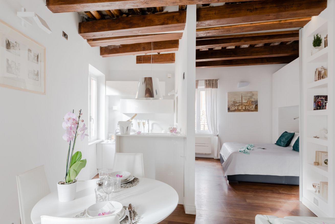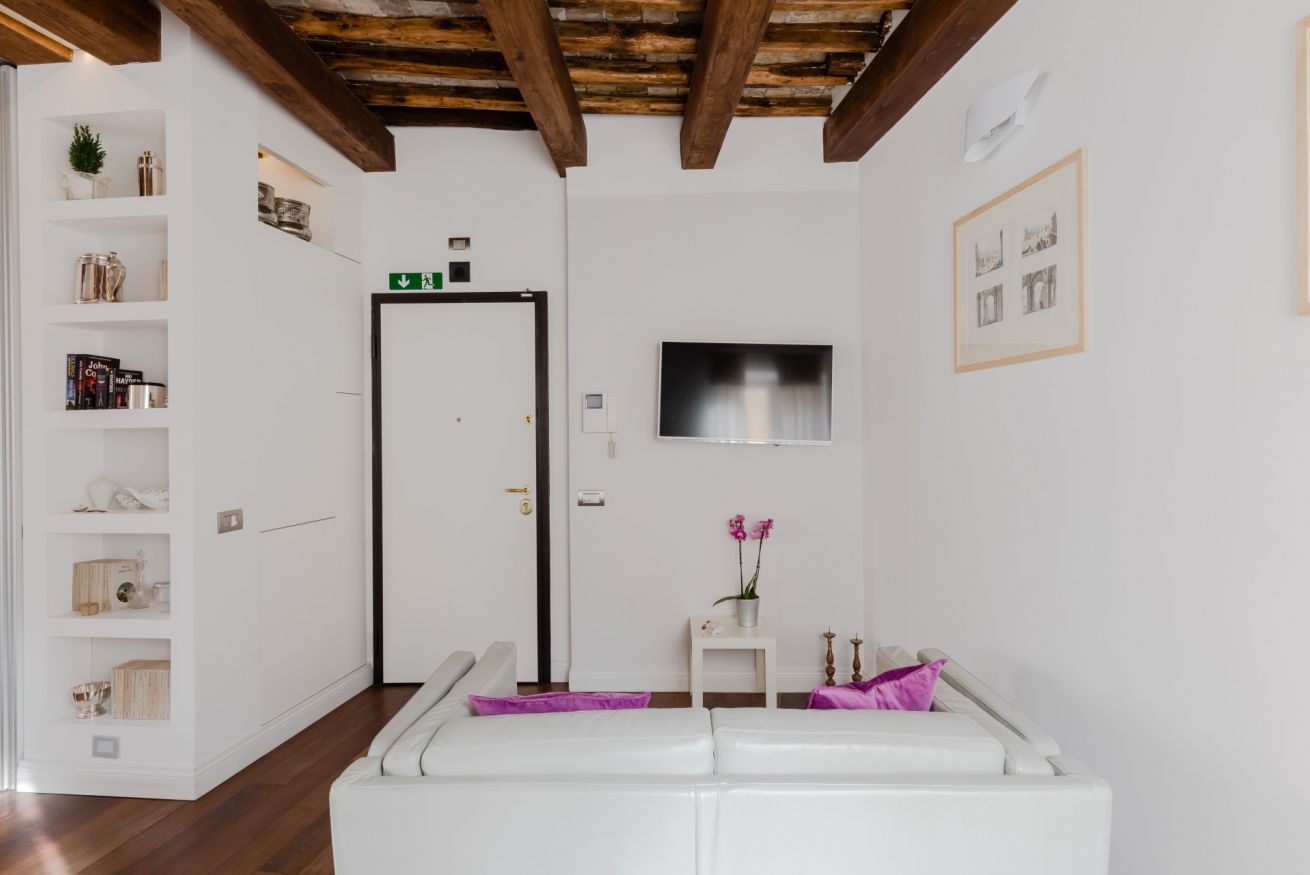 Questo incantevole appartamento situato al secondo piano dello storico Palazzo Ciancaleoni, a due passi dal Colosseo, è completo di ogni comfort.