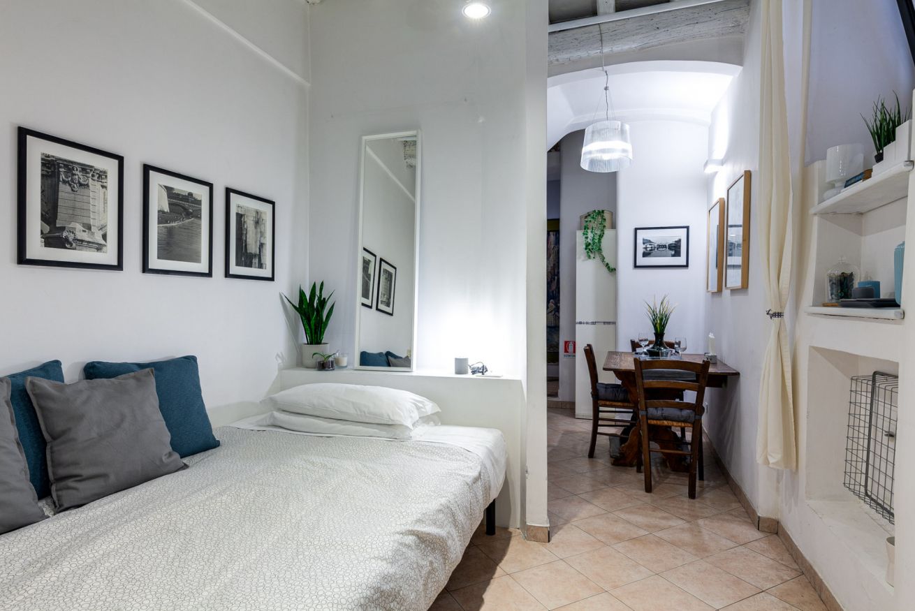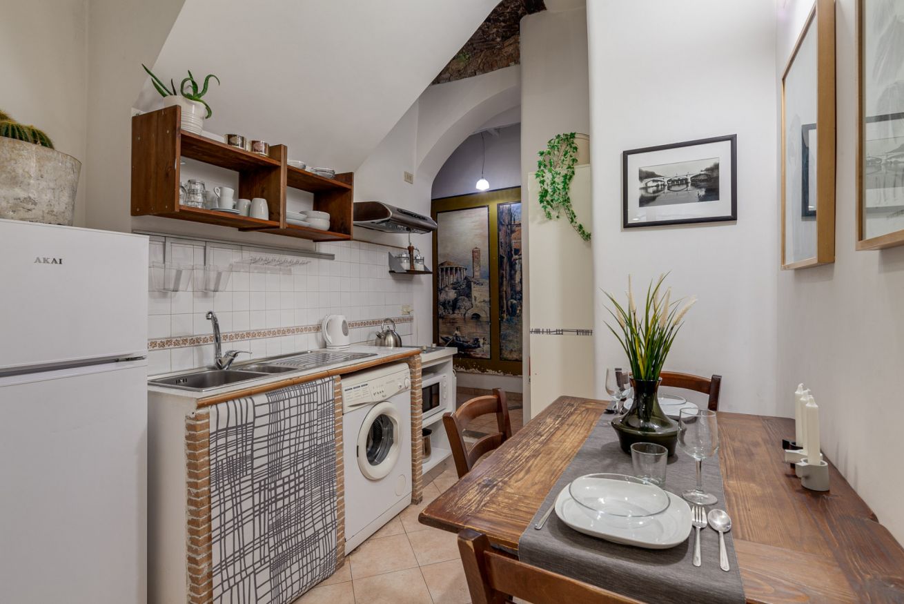 Dotato di un ingresso indipendente in uno dei più tipici vicoli della Capitale, questo appartamento dallo stile bohémien, è finemente arredato e composto da una zona letto/soggiorno; una cucina attrezzata e tavolo in legno ed un bagno con doccia.